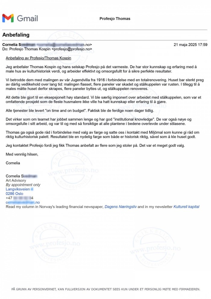 Jeg anbefaler Thomas og hans selskap Profesjo på det varmeste. De har stor kunnskap og erfaring med åmale hus av kulturhistorisk verdi, og arbeider effektivt og omsorgsfullt for å sikre perfekte resultater. Vi betrodde dem med malingen av vår Jugendvilla fra 1916 i forbindelse med en totalrenovering. LINOLJEMALING (...) Alt dette ble gjort til en eksepsjonelt høy standard. Alle tjenester ble levert "on time and on budget". Faktisk ble de ferdige noen dager tidlig.