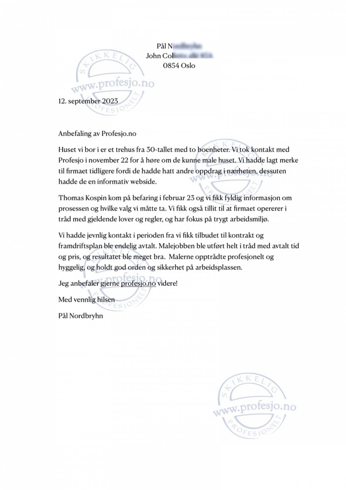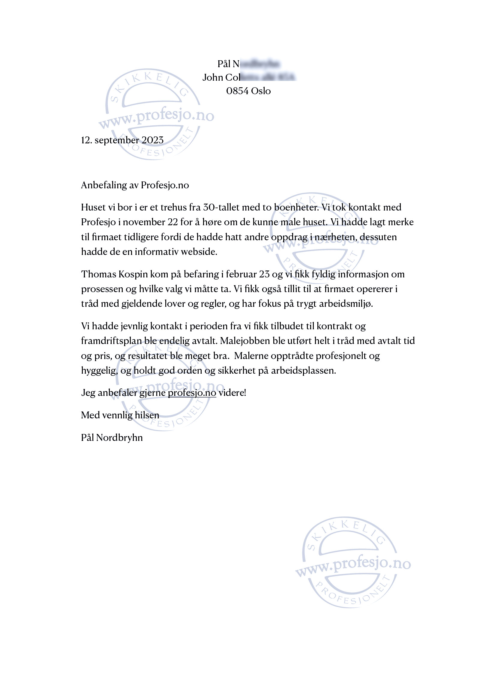 merFasademalingen på vår tomanns-bolig fra 1929 var i svært dårlig forfatning, grunnet opprinnelig linolje (…) Malerfirmaet Profesjo v/Thomas ble valgt på bakgrunn av mottatt tilbud og web-siden med svært gode referanser og fokus på de ansattes sikkerhet og rettigheter. Vi fikk også et veldig godt inntrykk under befaringen, og kontrakten var godt og grundig spesifisert. (…) . Men det ble utført et meget grundig rengjørings- og skrapearbeid. Vi så det som en fordel både praktisk og økonomisk at de hadde sitt eget stillas med nødvendige godkjenninger for håndtering. (…) Malerne var en sammensveiset gjeng som hadde jobbet lenge sammen og kjente hverandre godt. De var meget arbeidsomme og dyktige.(…) Han hadde gode råd å gi basert på kompetanse og erfaring. Arbeidet ble utført til avtalt tid og avtalt pris med svært godt resultat. (...)