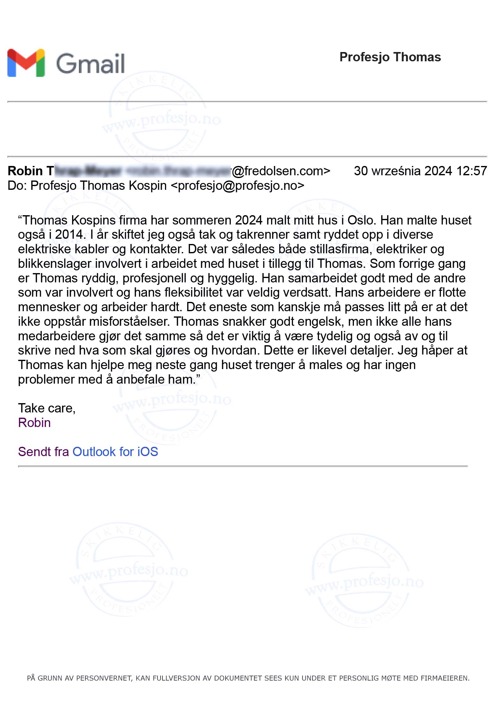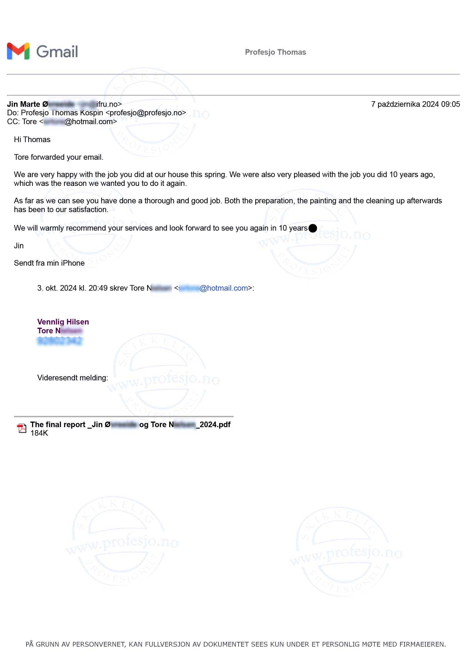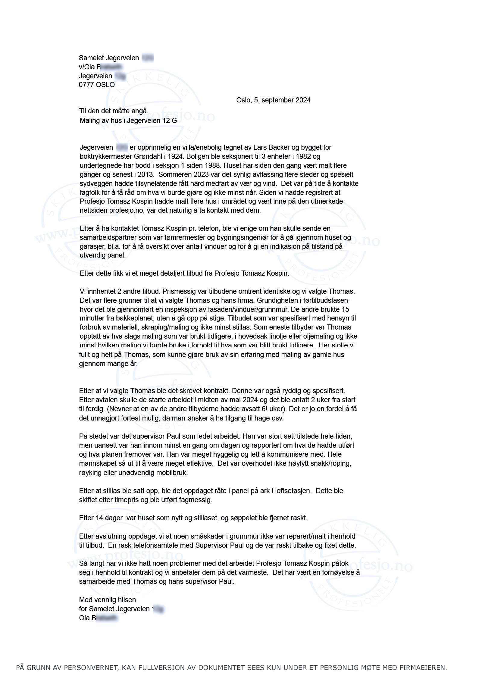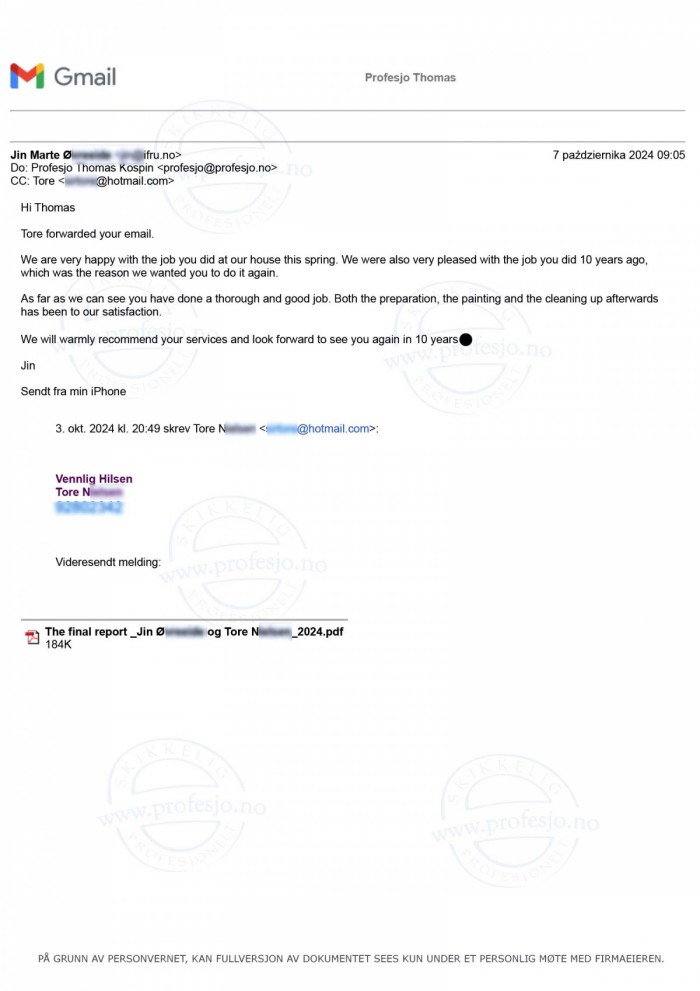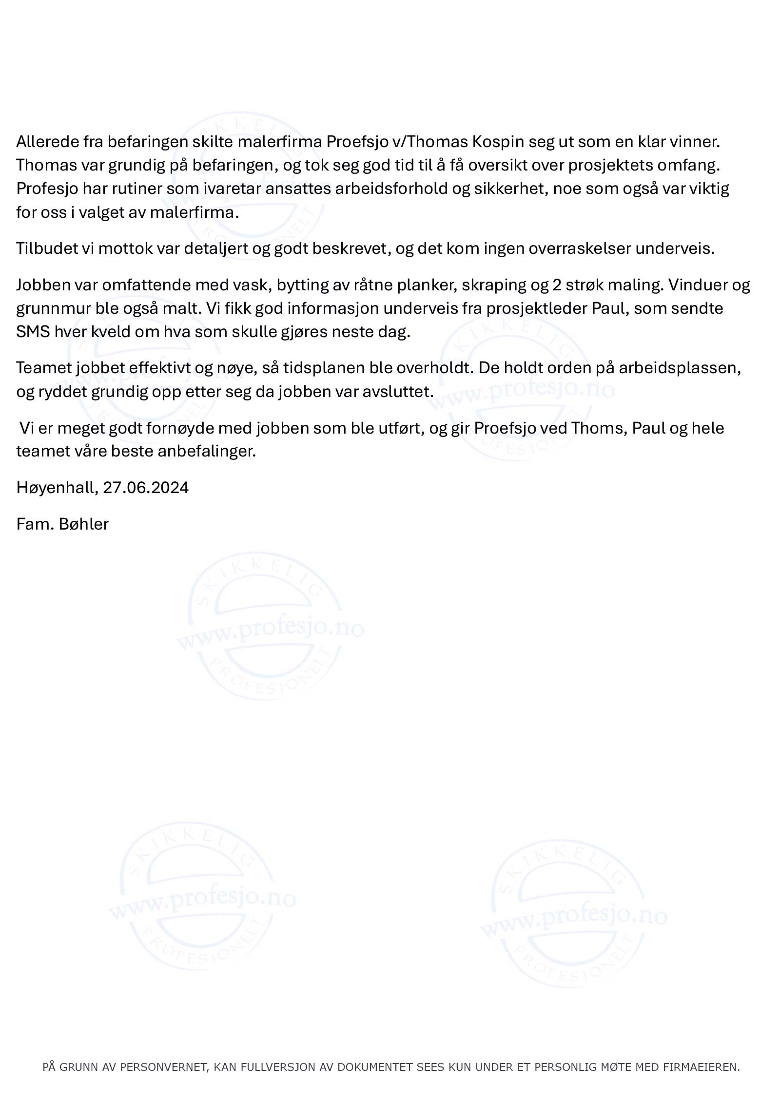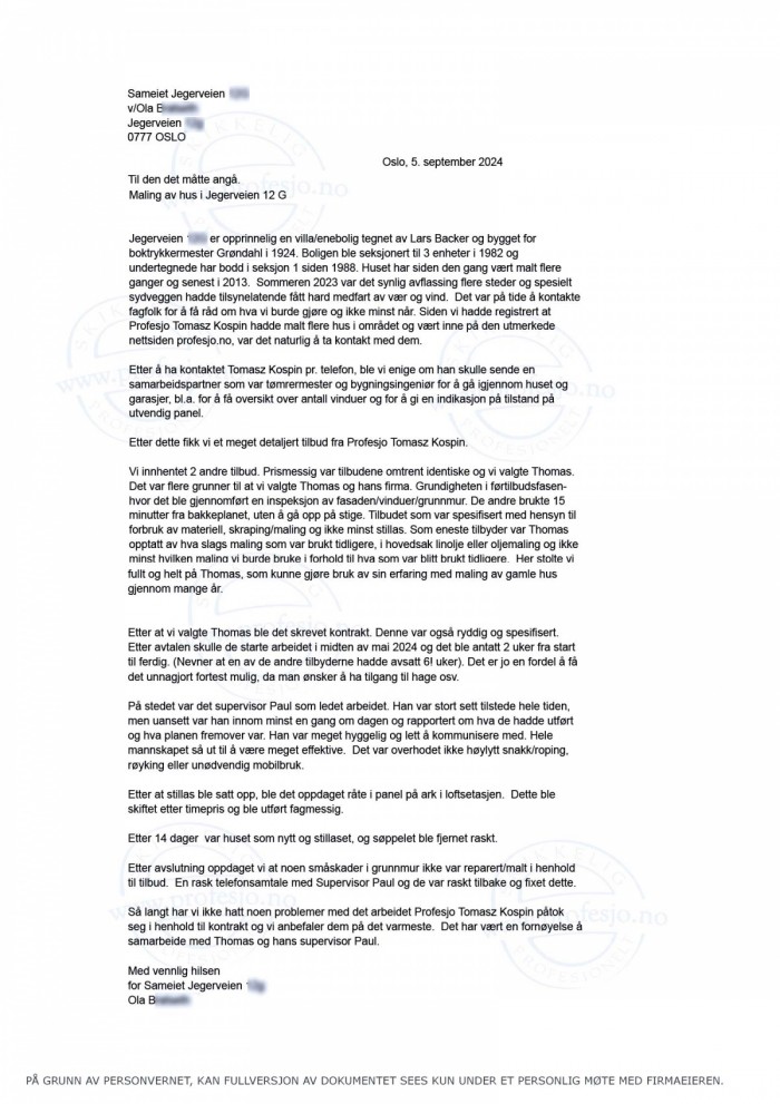 As far as we can see you have done a thorough and good job. Both the preparation, the painting and the cleaning up afterwardshas been to our satisfaction.