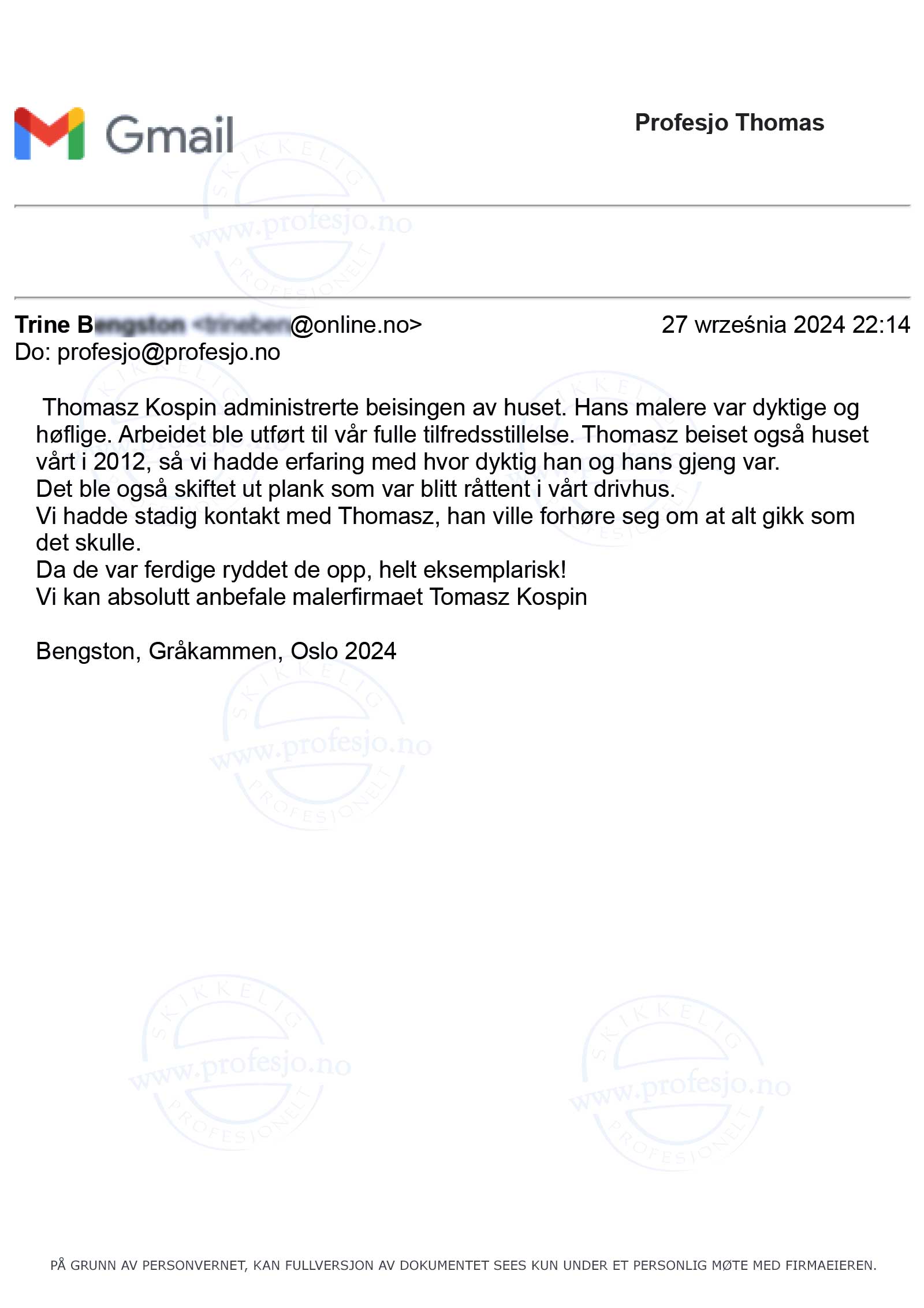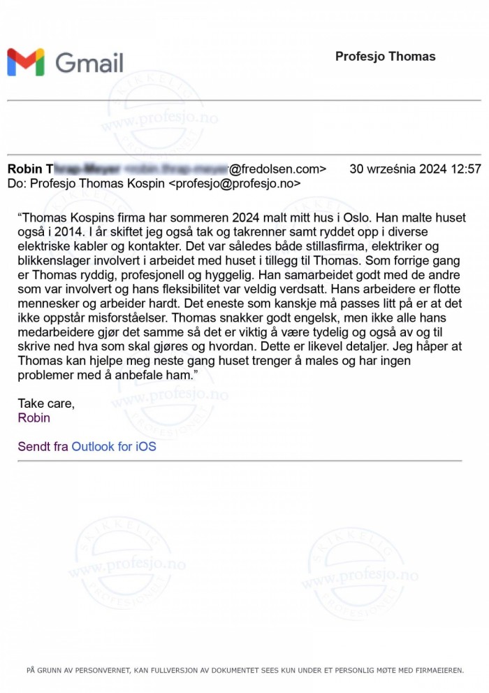 mer(...) firma har sommeren 2024 malt mitt hus i Oslo. Han malte husetogså i 2014. (...) Som forrige ganger Thomas ryddig, profesjonell og hyggelig. Han samarbeidet godt med de andresom var involvert og hans fleksibilitet var veldig verdsatt. Hans arbeidere er flottemennesker og arbeider hardt. (...) Jeg håper atThomas kan hjelpe meg neste gang huset trenger å males og har ingenproblemer med å anbefale ham.