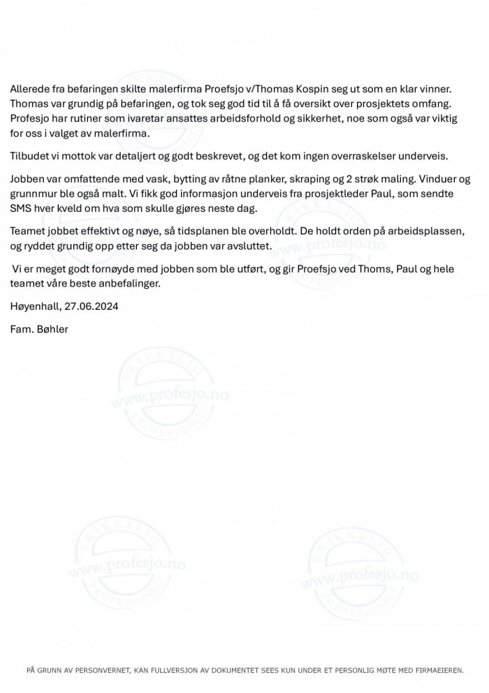 merAllerede fra befaringen skilte malerfirma Proefsjo seg ut som en klar vinner. Thomas var grundig på befaringen, og tok seg god tid til å få oversikt over prosjektets omfang. Profesjo har rutiner som ivaretar ansattes arbeidsforhold og sikkerhet, noe som også var viktig for oss i valget av malerfirma. Tilbudet vi mottok var detaljert og godt beskrevet, og det kom ingen overraskelser underveis. (...)