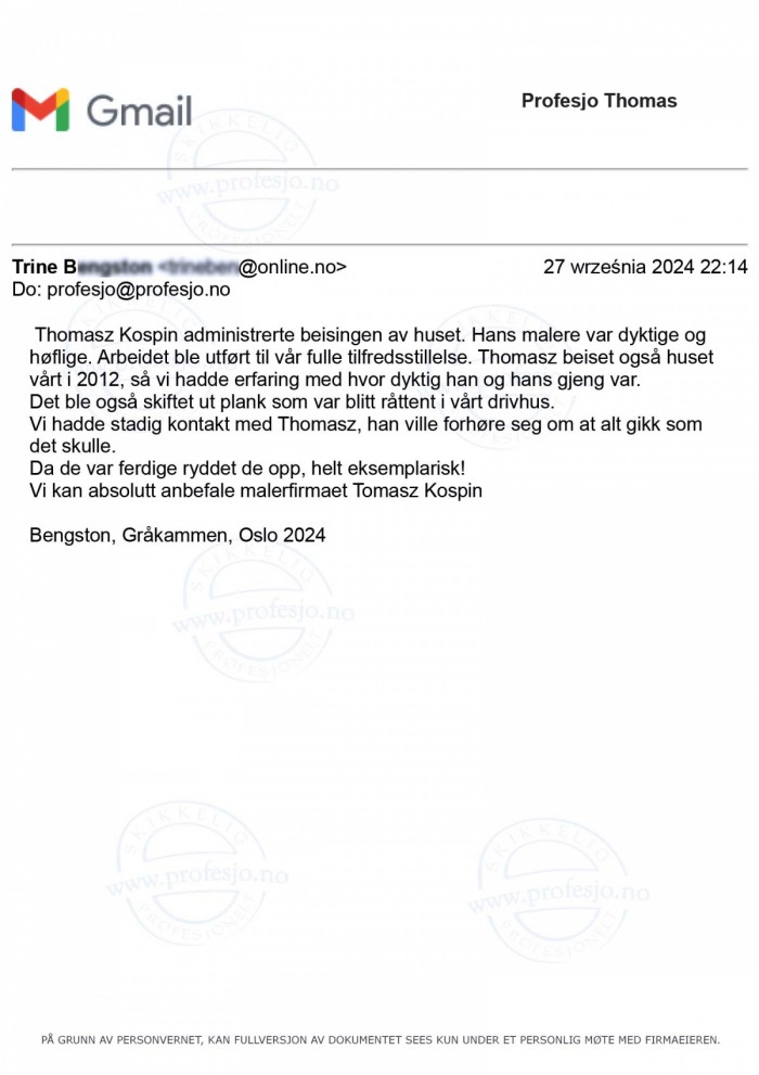 Vi hadde stadig kontakt med Thomasz, han ville forhøre seg om at alt gikk somdet skulle. Da de var ferdige ryddet de opp, helt eksemplarisk! Vi kan absolutt anbefale malerfirmaet Tomasz Profesjo.no (...)