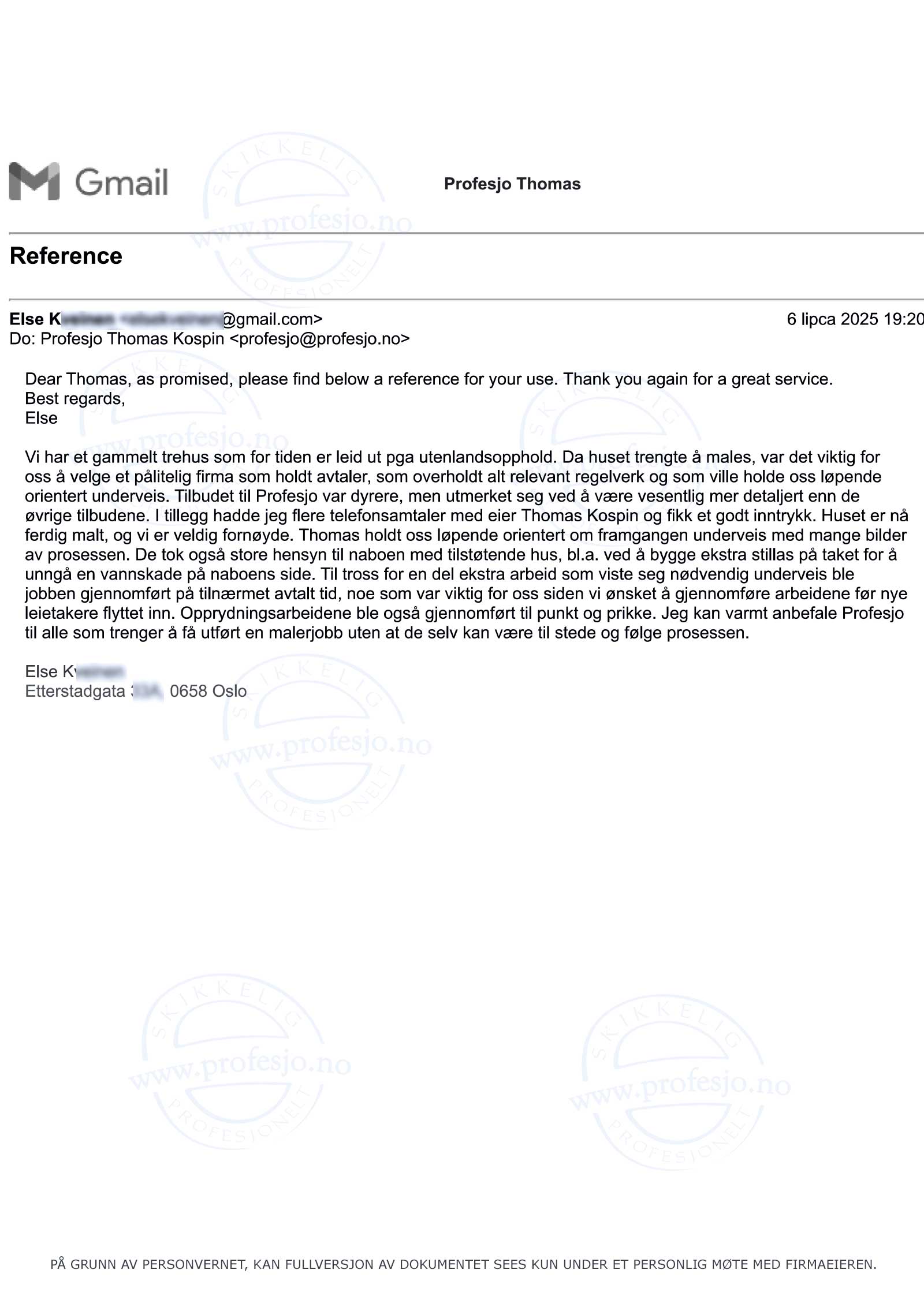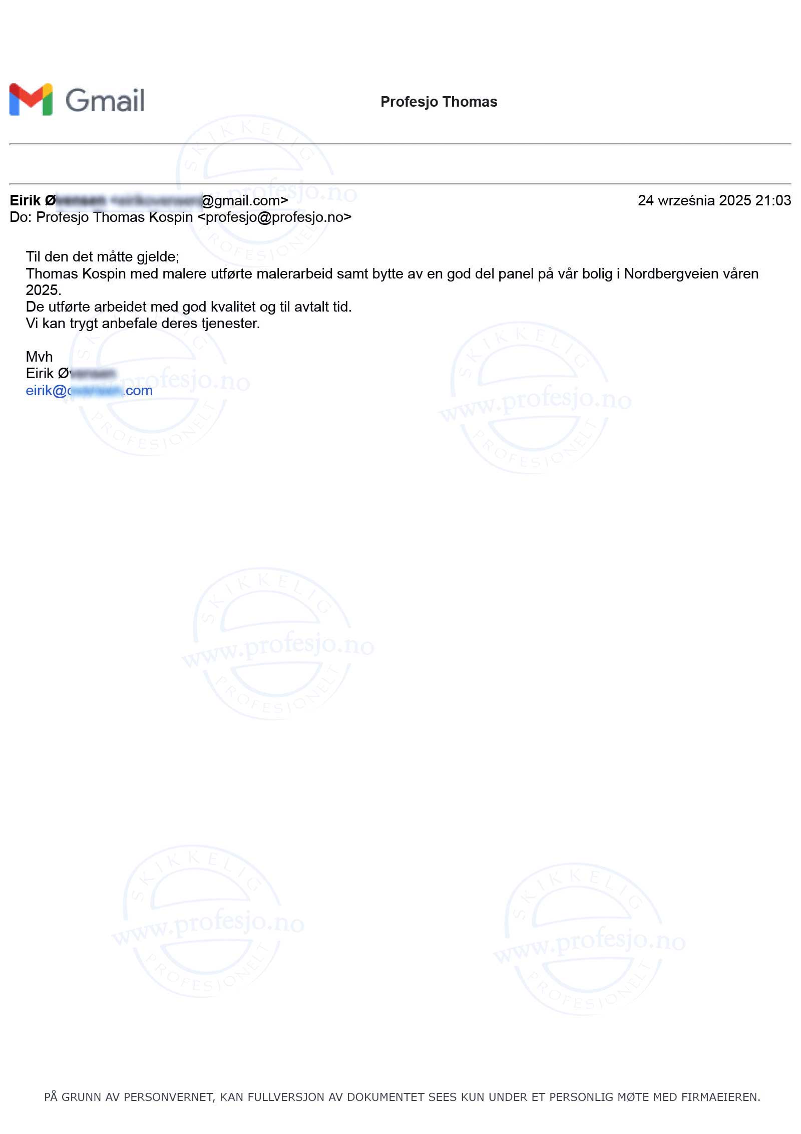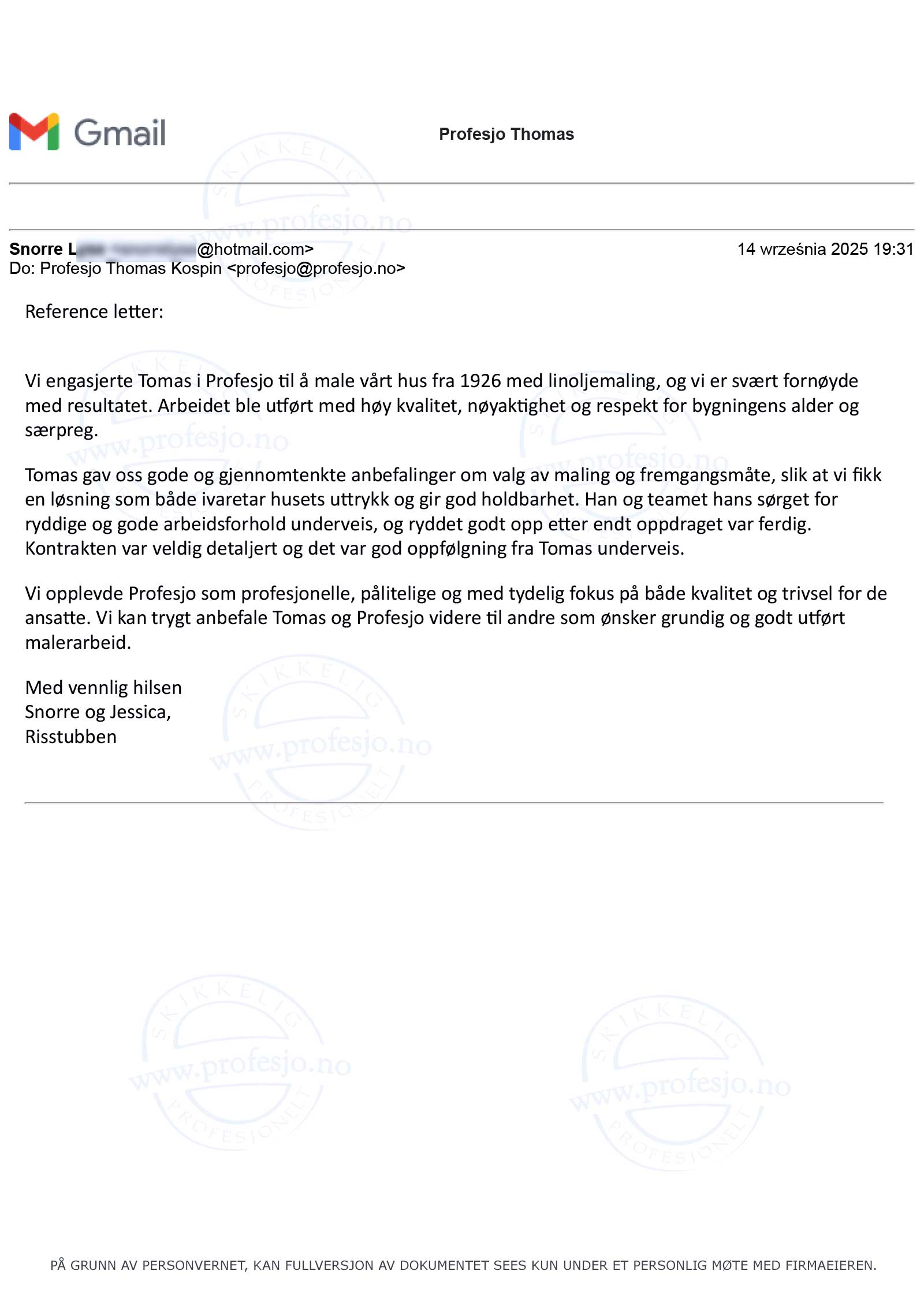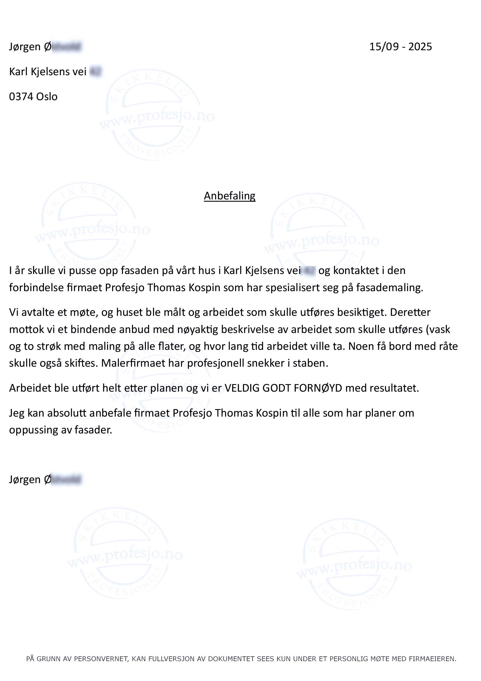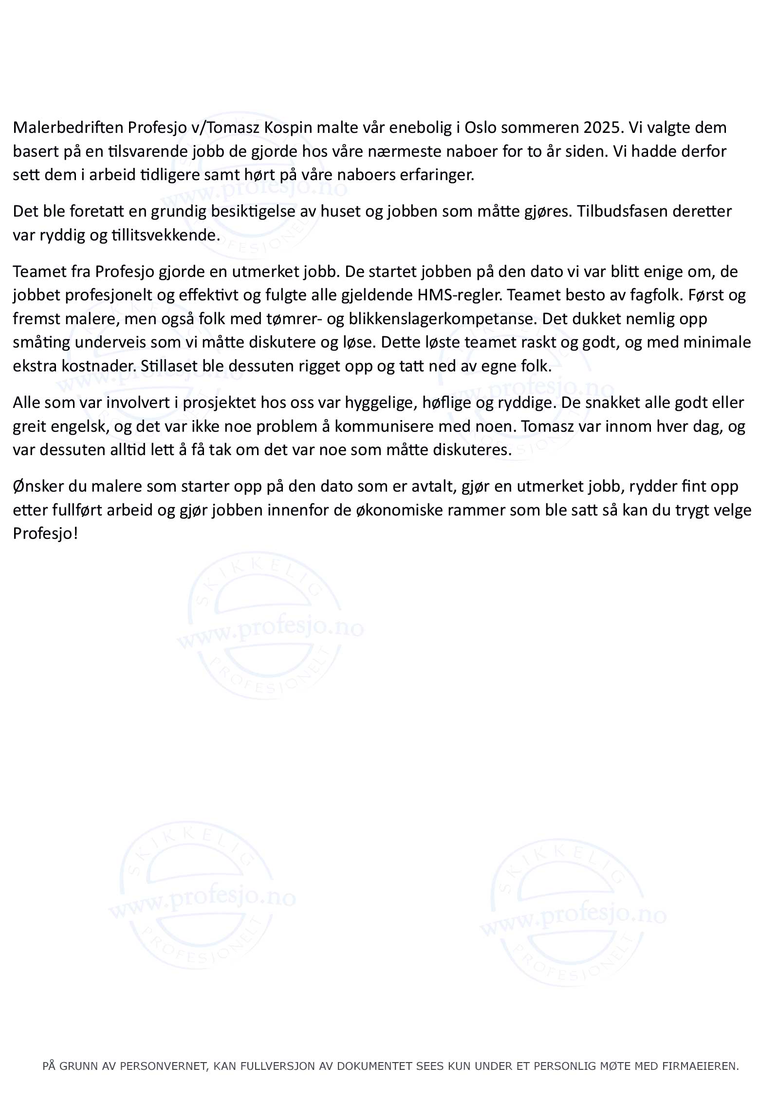 Jeg kan varmt anbefale Profesjo til alle som trenger å få utført en malerjobb uten at de selv kan være til stede og følge prosessen.