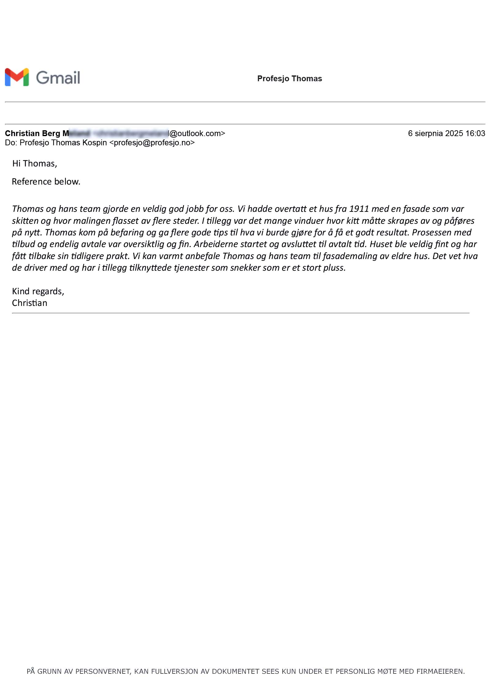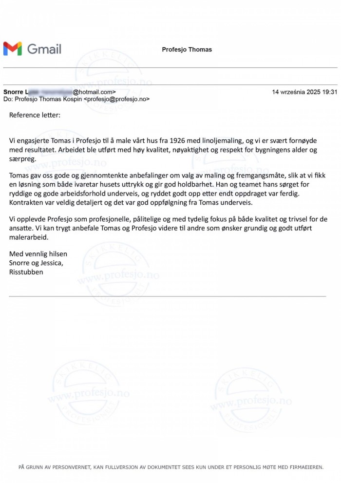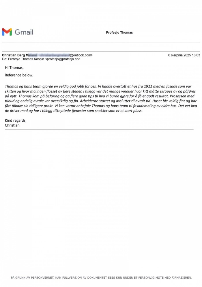 merVi engasjerte Tomas i Profesjo til å male vårt hus fra 1926 med linoljemaling, og vi er svært fornøyde med resultatet. (...)