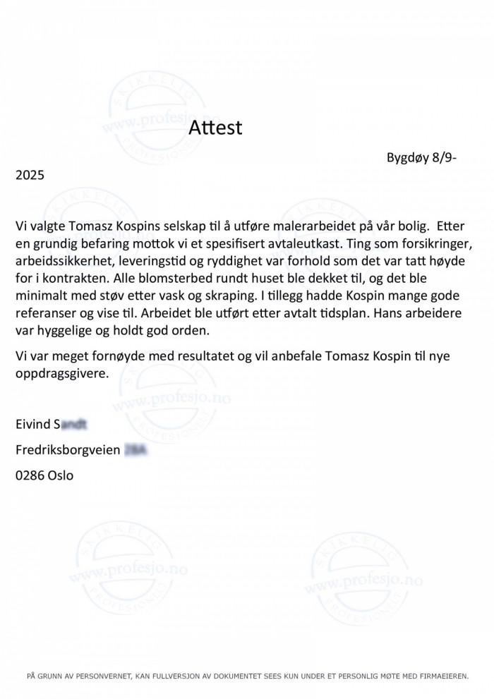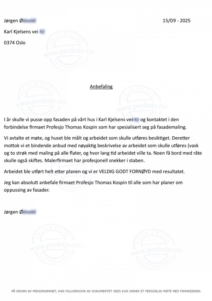 (...) Etter en grundig befaring mottok vi et spesifisert avtaleutkast. Ting som forsikringer, arbeidssikkerhet, leveringstid og ryddighet var forhold som det var tatt høyde for i kontrakten. Alle blomsterbed rundt huset ble dekket til, og det ble minimalt med støv etter vask og skraping. I tillegg hadde Profesjo mange gode referanser og vise til. Arbeidet ble utført etter avtalt tidsplan. Hans arbeidere var hyggelige og holdt god orden. (...) Linoljemaling.