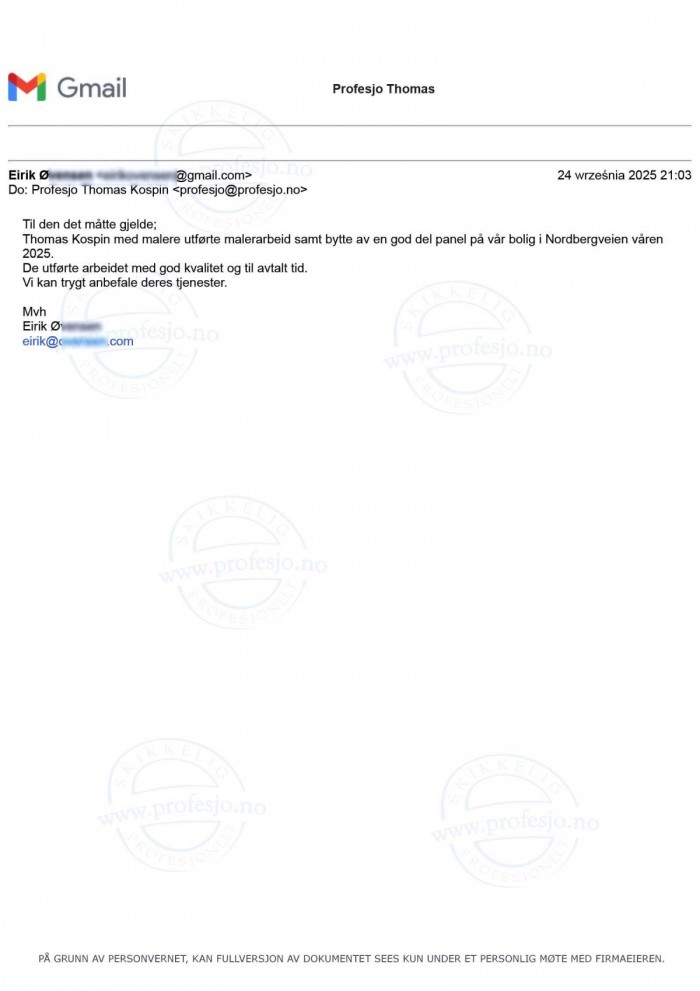 (...) Thomas med malere utførte malerarbeid samt bytte av en god del panel på vår bolig i Nordbergveien våren2025.